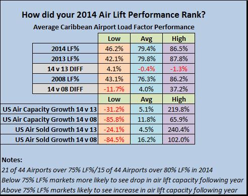 We recommend you check your Island’s air lift capacity and flight occupancy against the above chart to gauge your relative performance in the Caribbean. For example if you produced over 80% flight occupancy in 2014 you are performing better than average, under 79% flight occupancy and you are performing under the standard level and may want to elevate your efforts to support your current air lift.